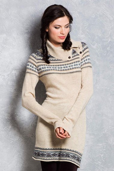Уютное теплое платье из вязаного полотна бежевого цвета с геометрическим орнаментом. Модель с длинными рукавами и большим асимметричным воротником, украшенным пуговицами.